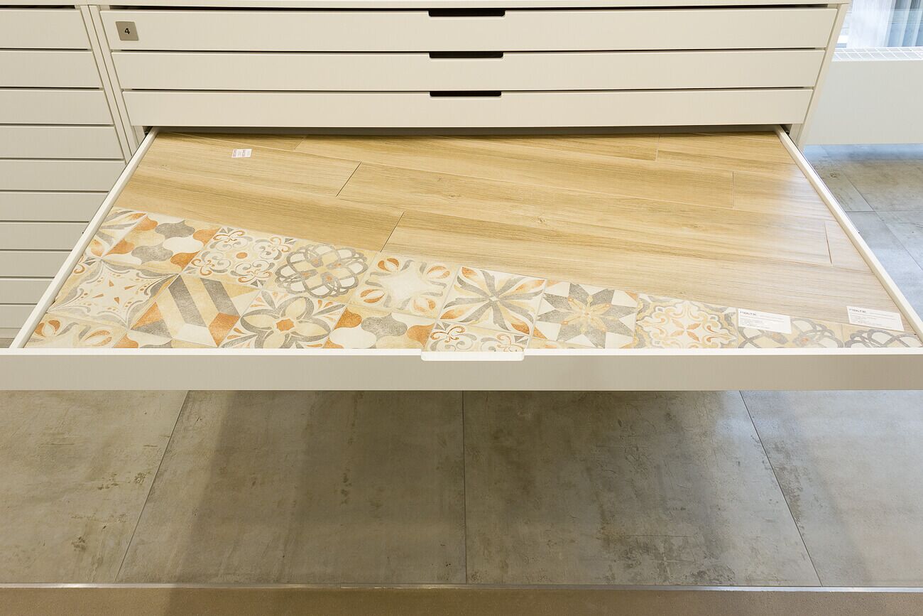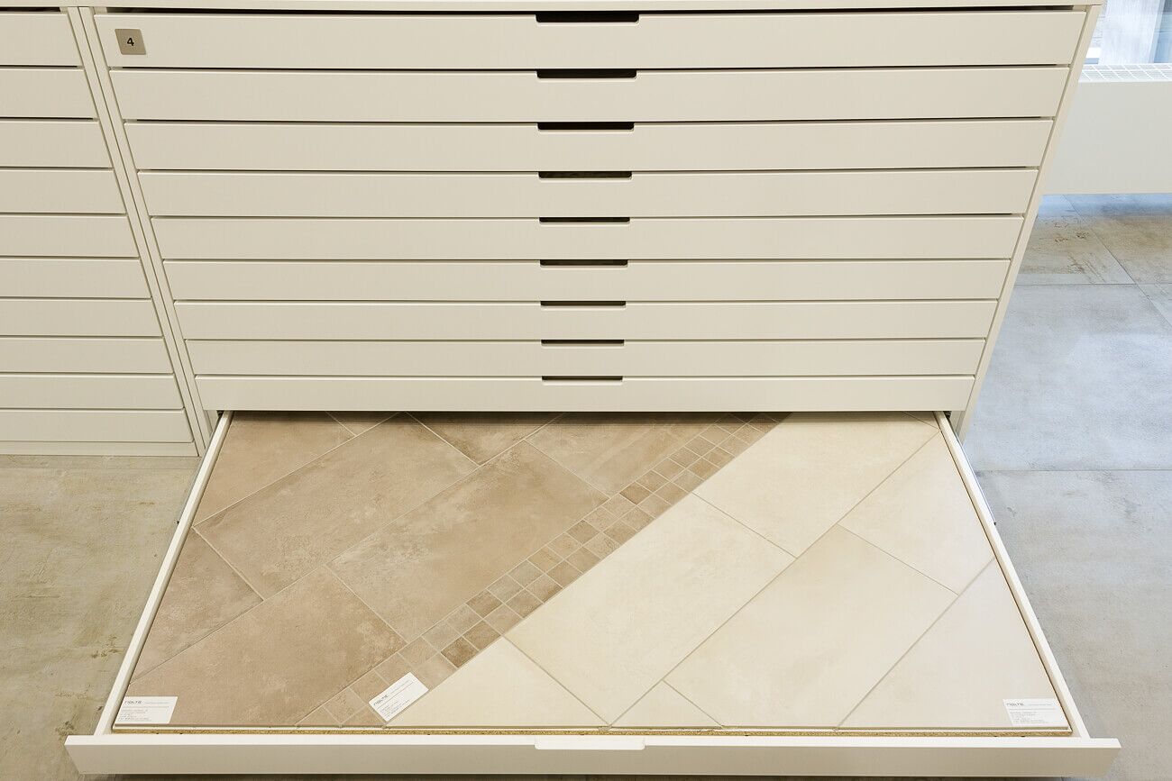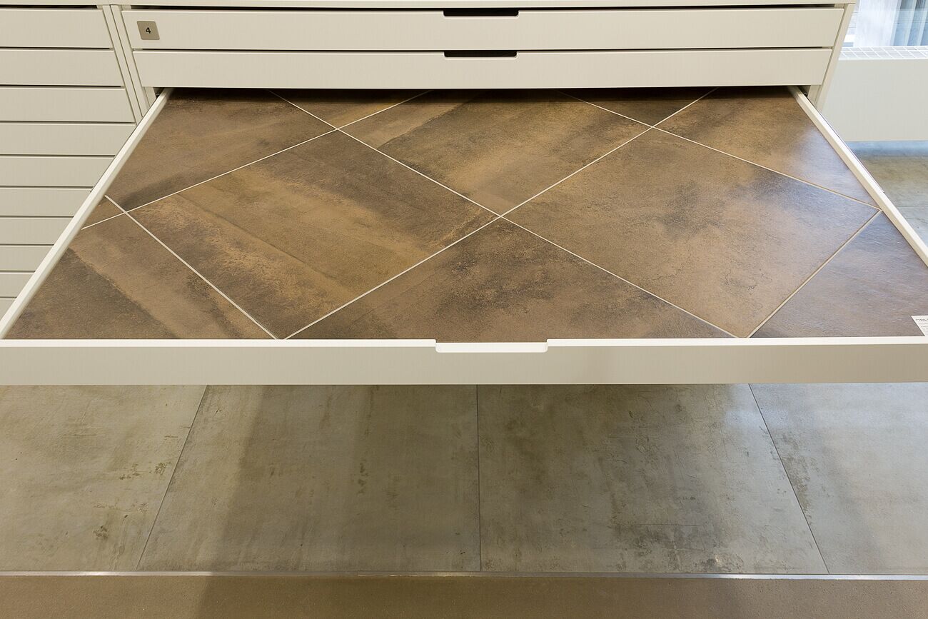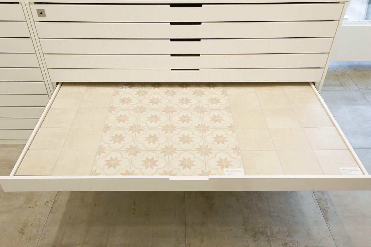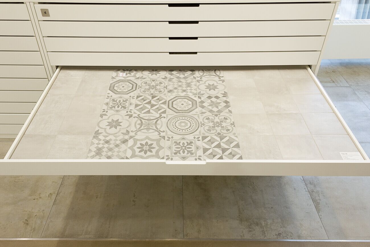 Hier sehen Sie die Übersicht des Musterschranks. Wenn Sie diese Seite weiter nach unten scrollen, sehen Sie jede einzelne Musterschublade und weiteren Informationen zu den gezeigten Fliesen. Weitere Informationen oder alternative Fliesen präsentieren wir Ihnen gern bei einem persönlichen Beratungsgespräch. -