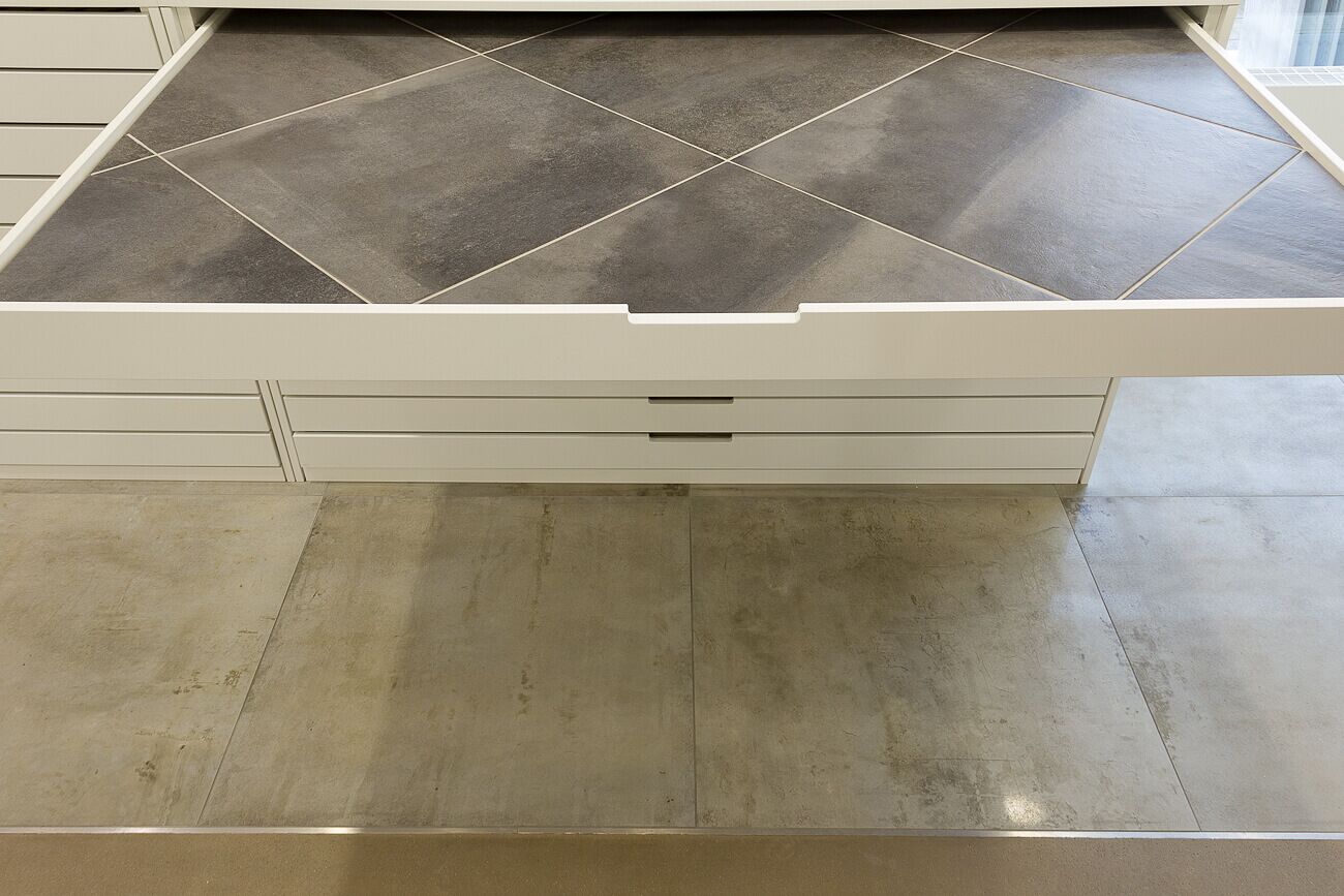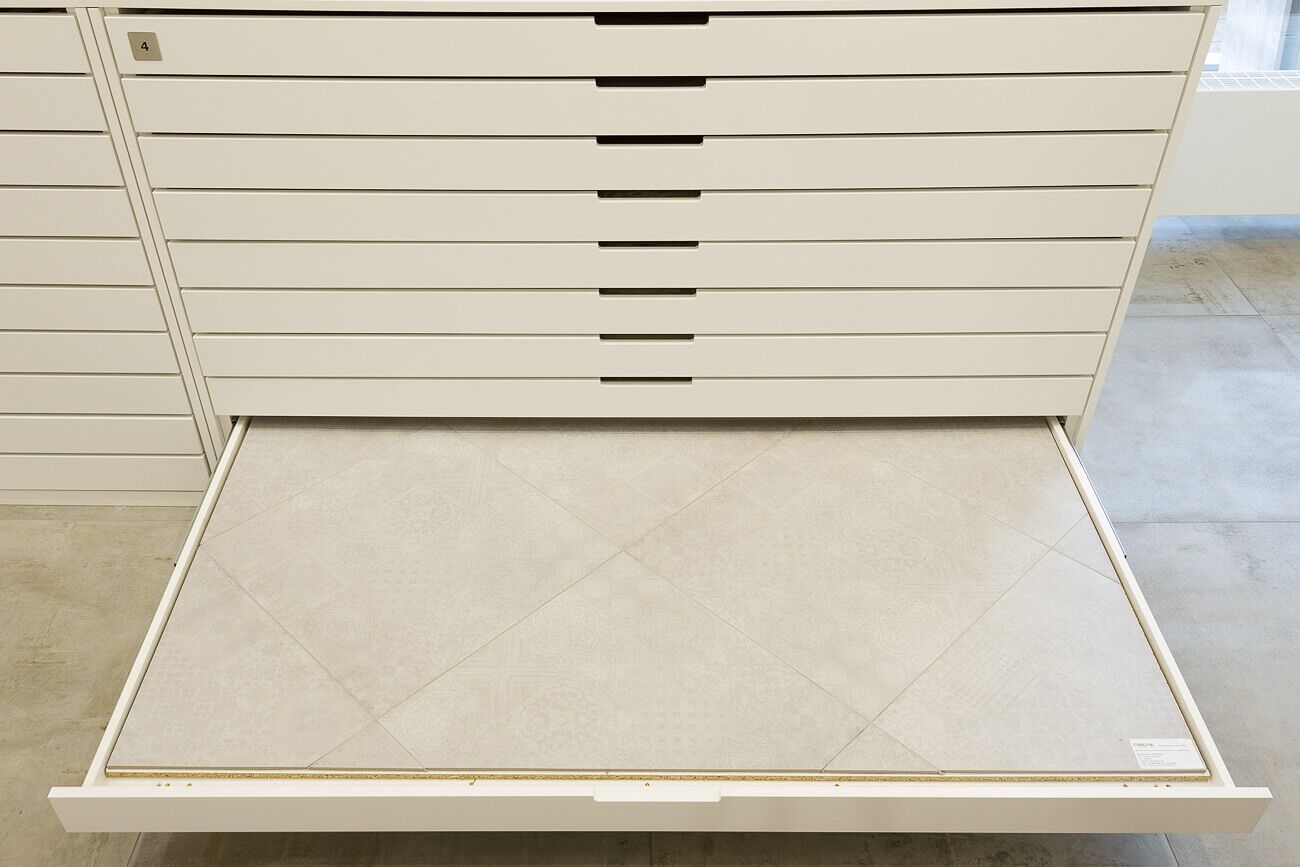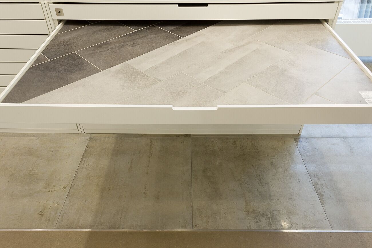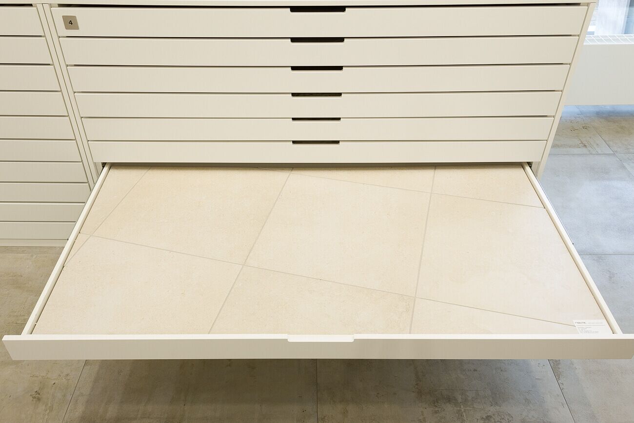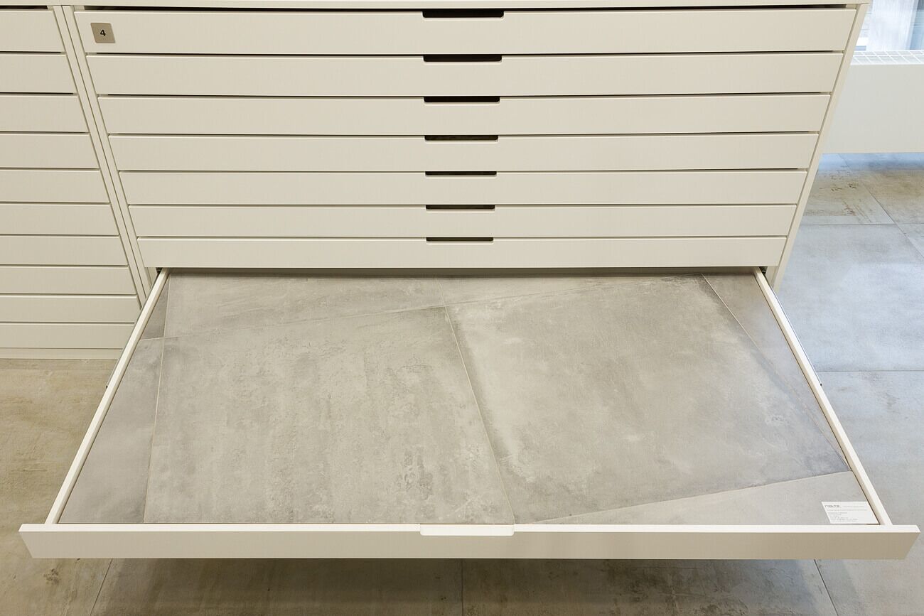 Hier sehen Sie die Übersicht des Musterschranks. Wenn Sie diese Seite weiter nach unten scrollen, sehen Sie jede einzelne Musterschublade und weiteren Informationen zu den gezeigten Fliesen. Weitere Informationen oder alternative Fliesen präsentieren wir Ihnen gern bei einem persönlichen Beratungsgespräch. -