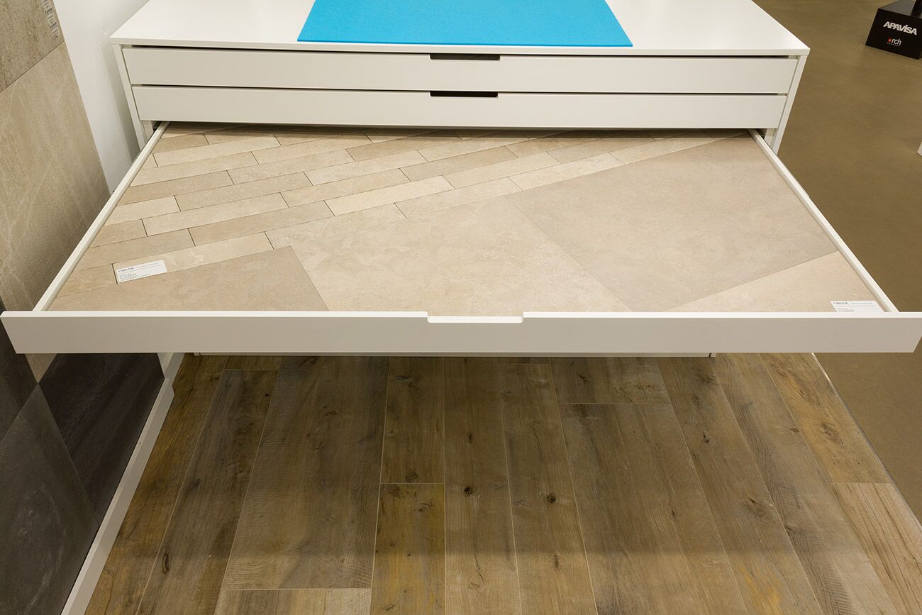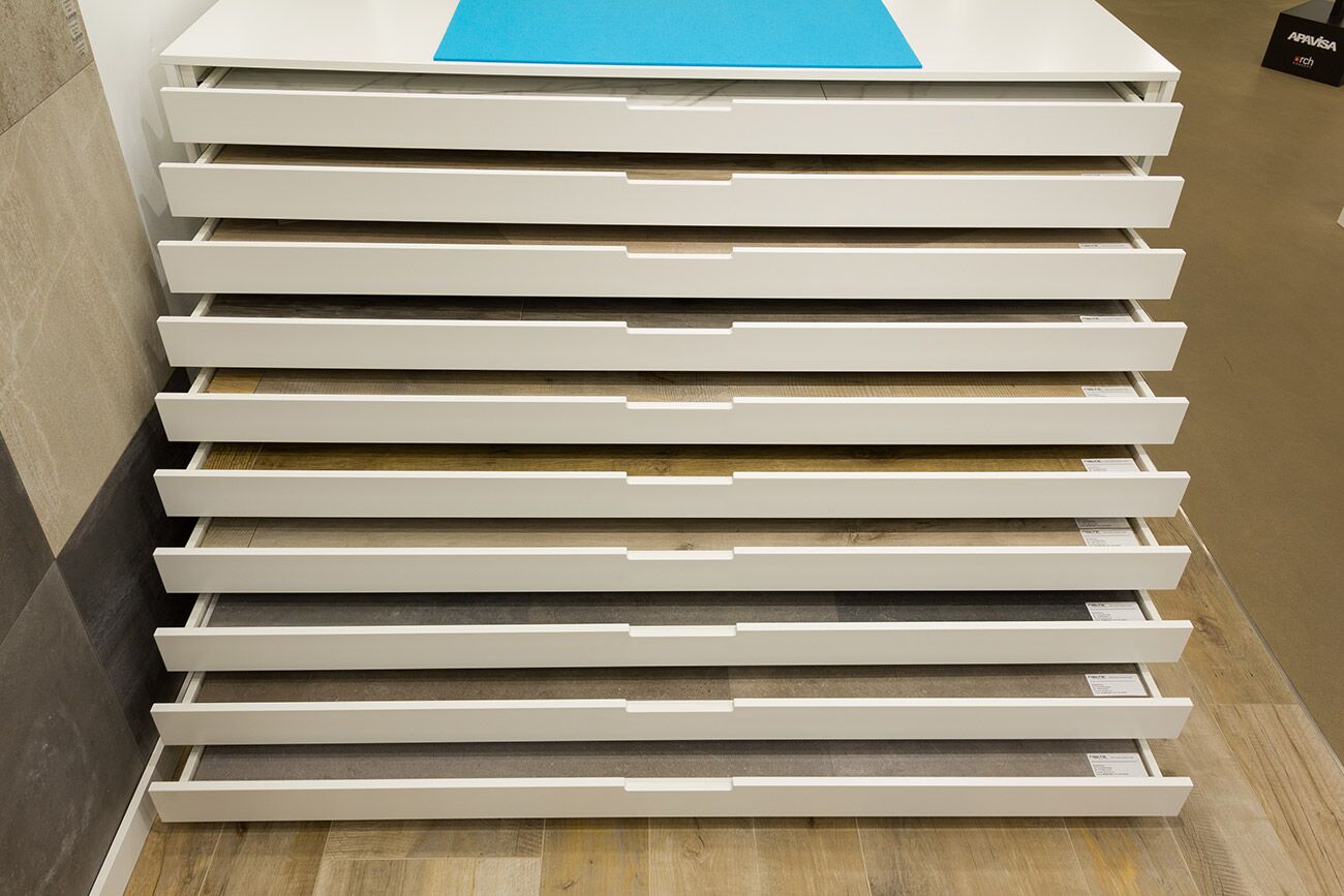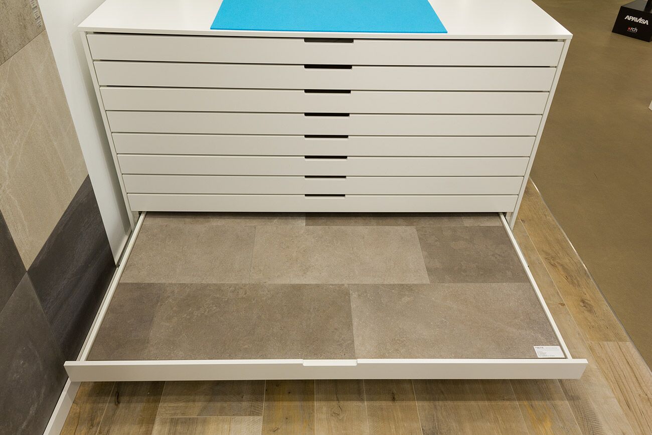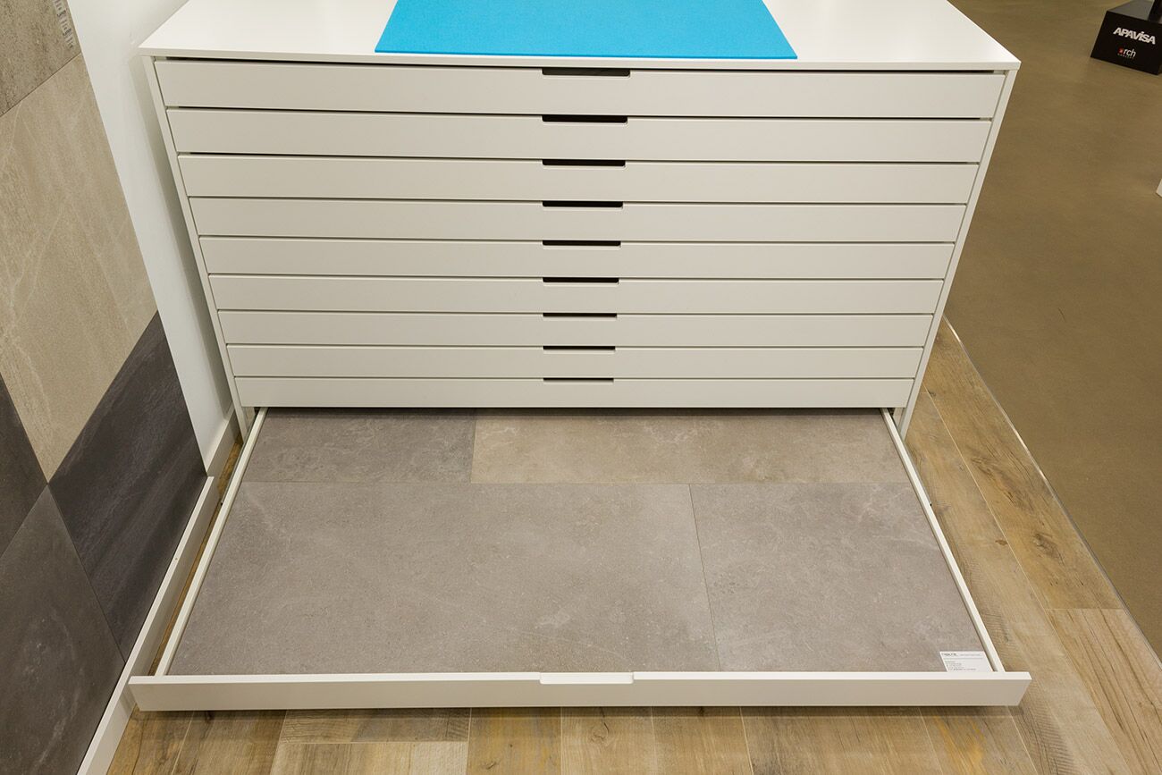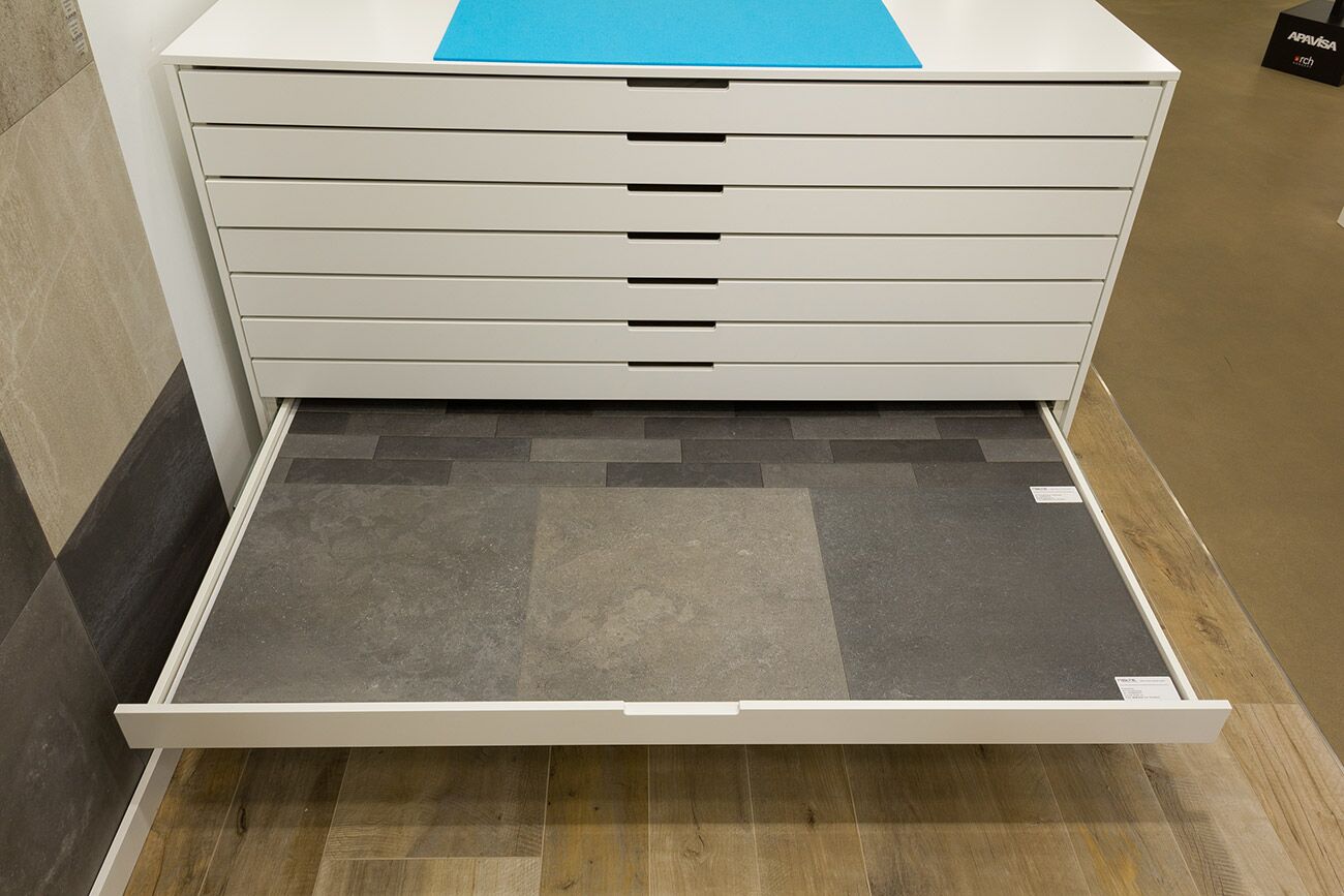 Hier sehen Sie die Übersicht des Musterschranks. Wenn Sie diese Seite weiter nach unten scrollen, sehen Sie jede einzelne Musterschublade und weiteren Informationen zu den gezeigten Fliesen. Weitere Informationen oder alternative Fliesen präsentieren wir Ihnen gern bei einem persönlichen Beratungsgespräch. -