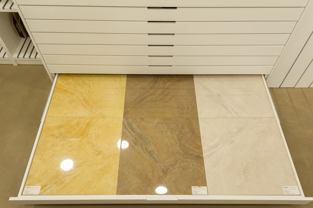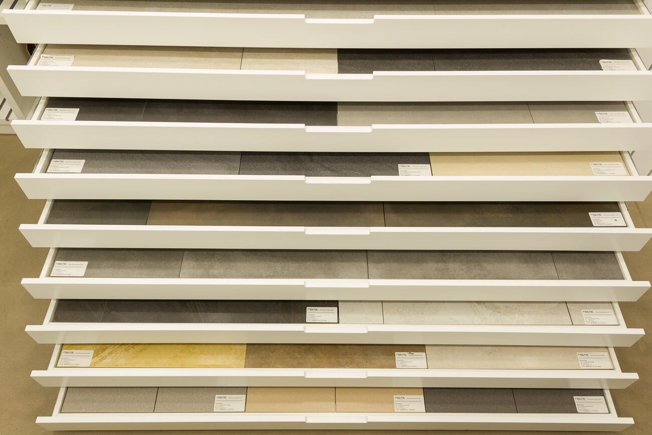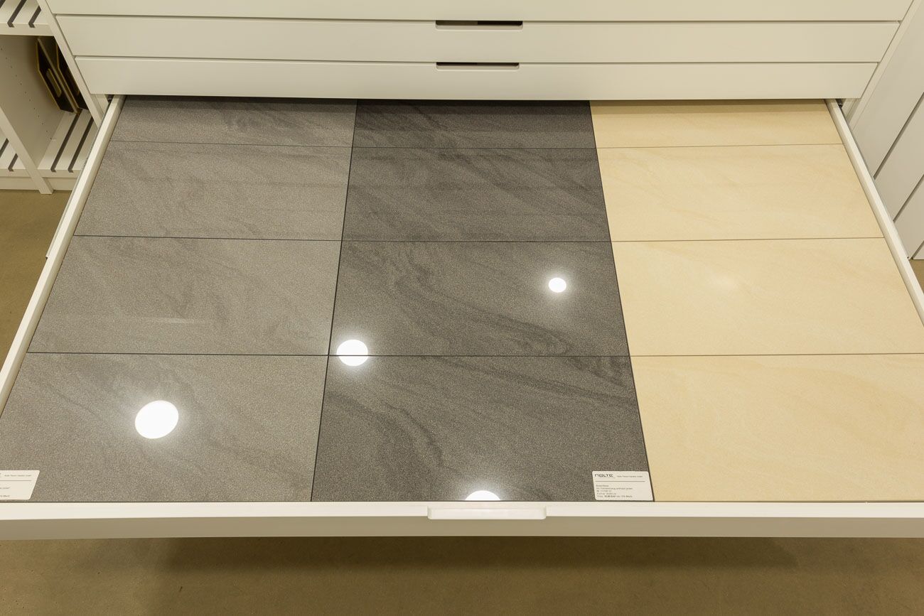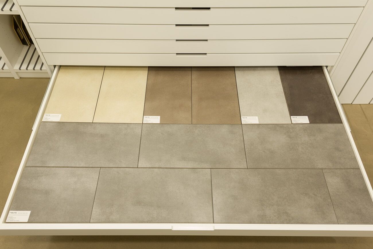 Hier sehen Sie die Übersicht des Musterschranks. Wenn Sie diese Seite weiter nach unten scrollen, sehen Sie jede einzelne Musterschublade und weiteren Informationen zu den gezeigten Fliesen. Weitere Informationen oder alternative Fliesen präsentieren wir Ihnen gern bei einem persönlichen Beratungsgespräch. -