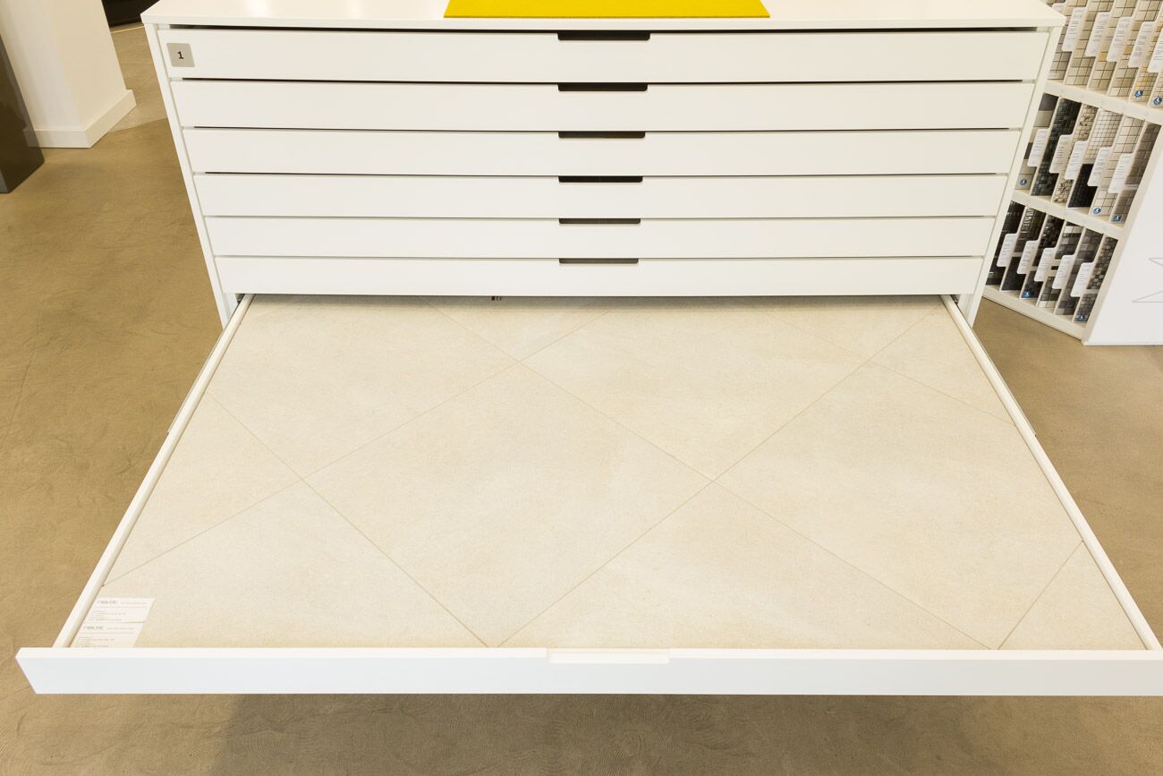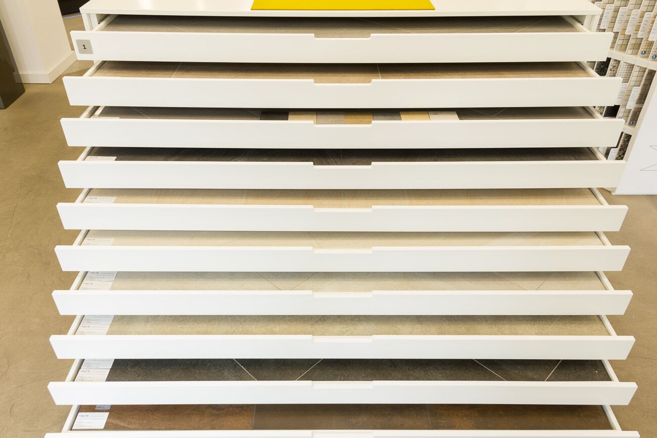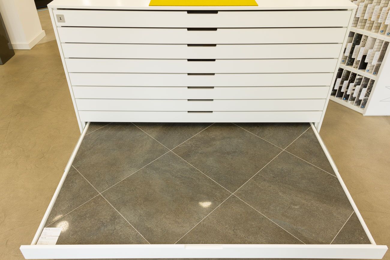 Hier sehen Sie die Übersicht des Musterschranks. Wenn Sie diese Seite weiter nach unten scrollen, sehen Sie jede einzelne Musterschublade und weiteren Informationen zu den gezeigten Fliesen. Weitere Informationen oder alternative Fliesen präsentieren wir Ihnen gern bei einem persönlichen Beratungsgespräch. -